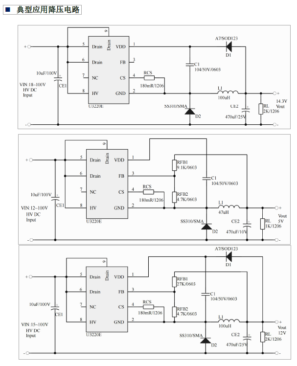 •主要特點:VIN: 12~100V(OUT:ADЛ;集成7A 100V (10A 100V) MOS;集成 180V 高壓啟動電路;多模式控制、無異音工作;支持升壓、降壓和升降壓拓撲;默認14.3V 輸出(FB 腳懸空);待機功耗低于 50mw;良好的線性調(diào)整率和負載調(diào)整率;集成軟啟動電路;內(nèi)部保護功能;過載保護 (OLP):逐周期電流限制(OCP);輸出過壓保護(OVP);VDD 過壓、欠壓和電壓箝位保護